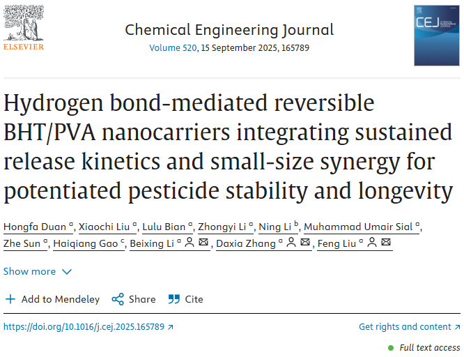 近日,我校植物保护学院刘峰教授团队在chemical engineering journal(一区top期刊,影响因子13.2),在线发表了题为“hydrogen bond-mediated reversible bht/pva nanocarriers integrating sustained release kinetics and small-size synergy for potentiated pesticide stability and longevity”的研究论文,山东农业大学刘峰教授、张大侠副教授、李北兴教授为该论文的共同通讯作者,硕士研究生段宏法为该论文的第一作者,相关工作得到国家自然科学基金的资助。