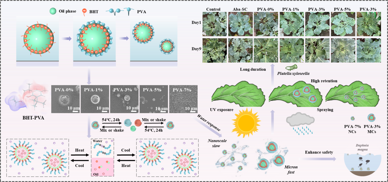 针对纳米制剂当前存在的“工艺繁琐、稳定困难、释放过快”问题,该研究以聚乙烯醇(pva)和丁基羟基甲苯(bht)为原料,采用一步溶胶-凝胶法,借助氢键作用实现了微/纳米颗粒的可逆制备与粒径调控。通过稳定包裹农药与抗氧化剂的协同作用,能够延缓光降解进程,可依据环境条件变化释放活性成分,进而减少损失,从材料设计与制备工艺双维度突破了传统工艺的局限。